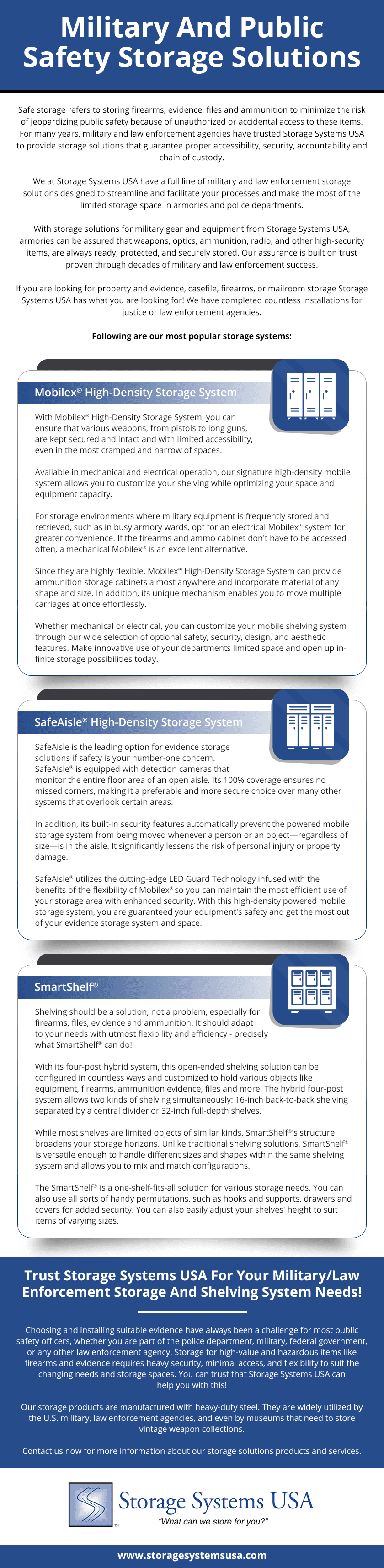 Choosing and installing suitable ammunition storage cabinets have always been a challenge for most public safety officers, whether you are part of the police department, military, federal government, or any other law enforcement agency. Storage for high-value and hazardous items like firearms and ammunition requires heavy security, minimal access, and flexibility to suit the changing needs and storage spaces. You can trust that Storage Systems USA can help you with this!